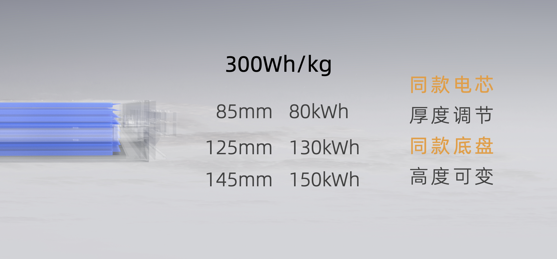 孚能科技SPS经过调理电芯厚度让底盘高度在85mm到145mm灵敏调理,搭载不同能量密度的大软包电芯,电池体系容量掩盖80kWh到150kWh,满意各类乘用车的电动化需求。同款底盘、一款电芯满意全系乘用车,为整车企业客户缩短研制周期,并下降收购本钱,保证供给安稳。